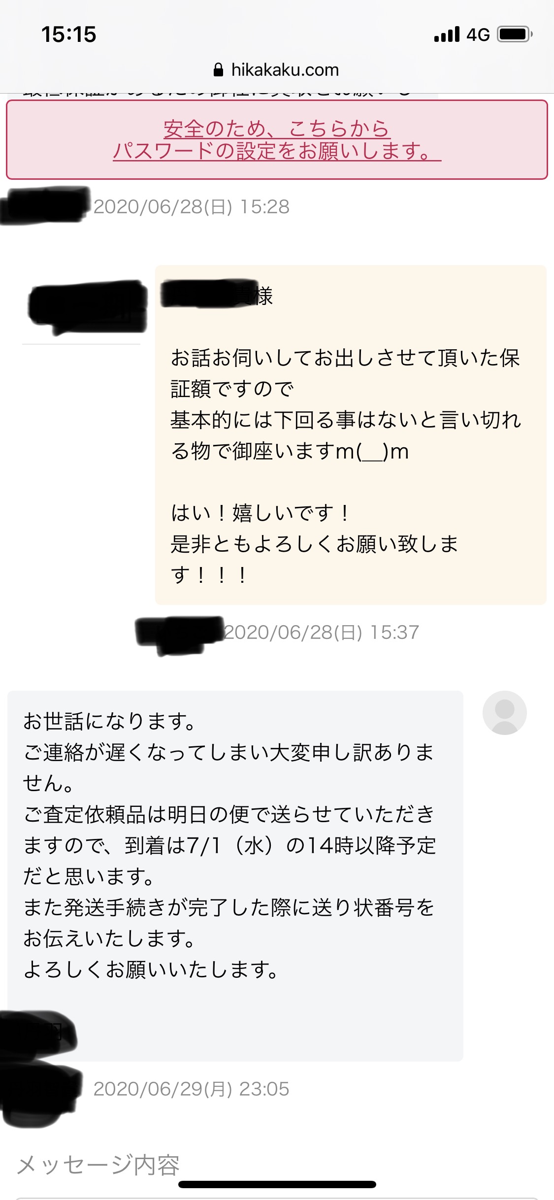 買取価格を伺っている中でチャットのメッセージを通じてやりとりをしていました。買取希望品の写真を複数枚送ったところ買取最低保証額というものを提示され、他買取業社様の提示価格より上だったため現物を送ったところ写真では確認出来なかった小傷があるとの理由で他買取業社様と同等の買取価格を提示されました。